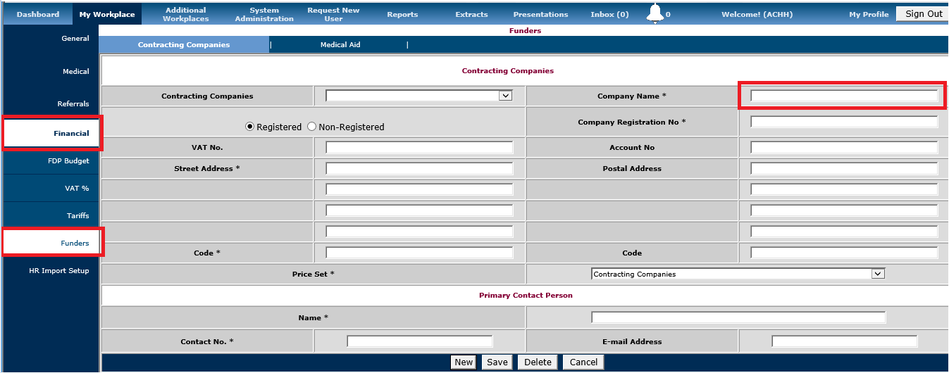 Select Financial => Funder to open the Contracting Companies to add new one.